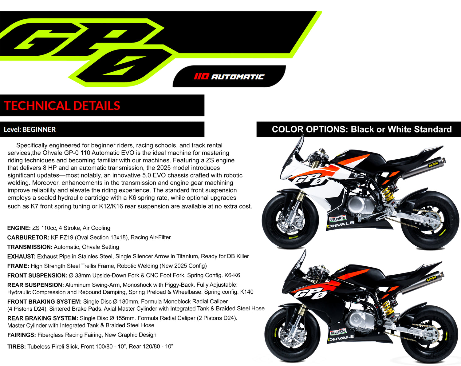 The perfect bike for youth road racing schools or a track rental program. Bombproof design that takes a beating while riders are learning without the need to focus on pesky things like a clutch! It is the perfect beginner’s bike with a manageable 8 horsepower and no gears to worry about.