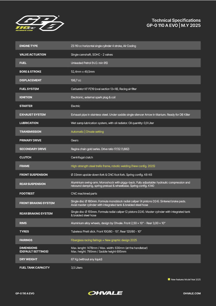 Specifically engineered for beginner riders, racing schools, and track rental services, the Ohvale GP-0 110 Automatic EVO is the ideal machine for mastering riding techniques and becoming familiar with our machines. Featuring a ZS engine that delivers 8 HP and an automatic transmission, the 2025 model introduces significant updates—most notably, an innovative 5.0 EVO chassis crafted with robotic welding. Moreover, enhancements in the transmission and engine gear machining improve reliability and elevate the riding experience. The standard front suspension employs a sealed hydraulic cartridge with a K6 spring rate, while optional upgrades such as K7 front spring tuning or K12/K16 rear suspension are available at no extra cost.